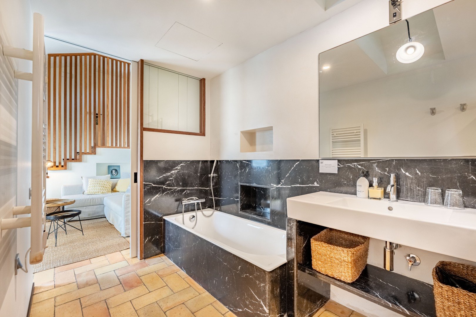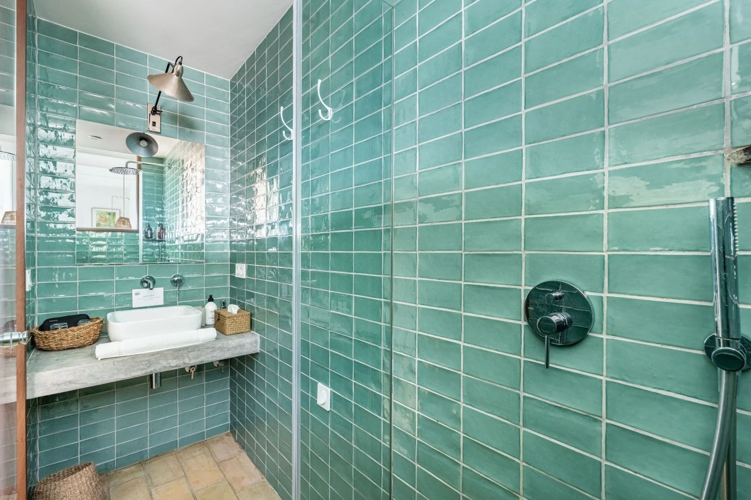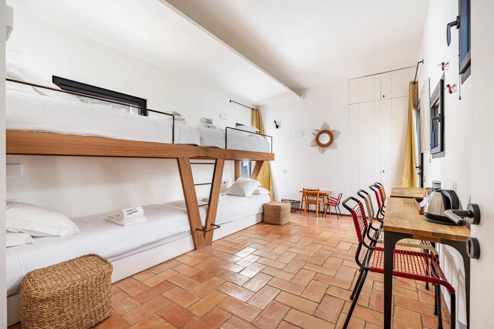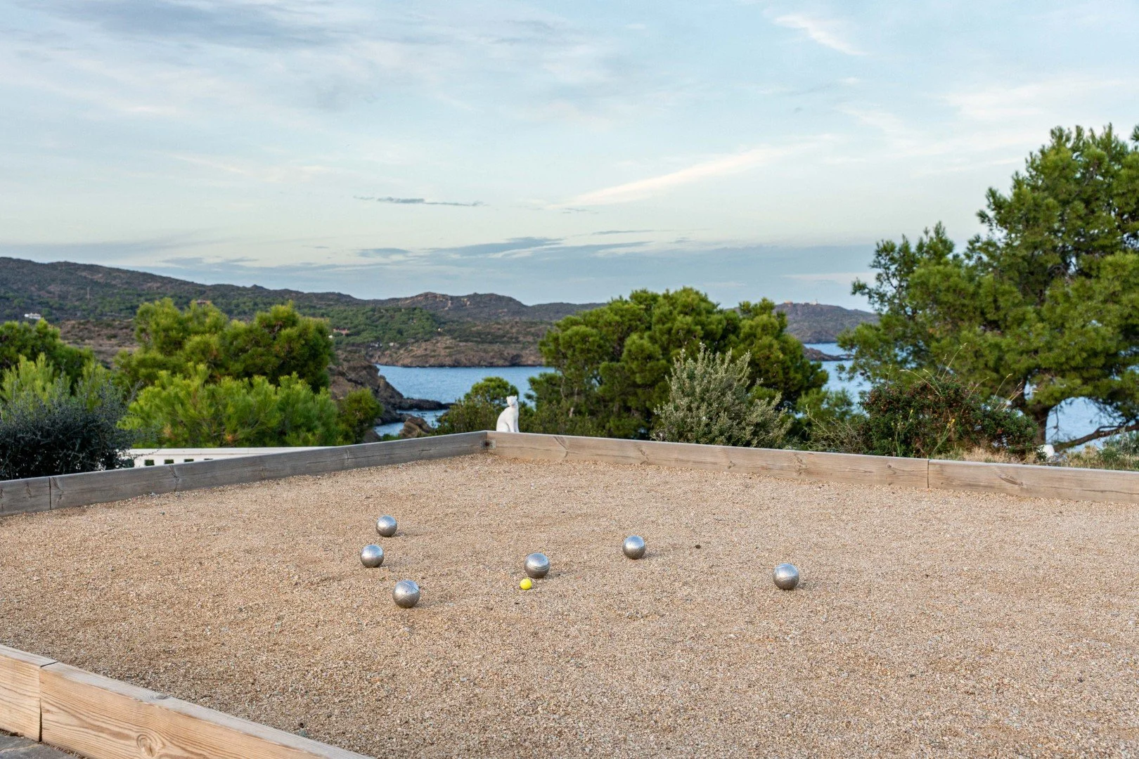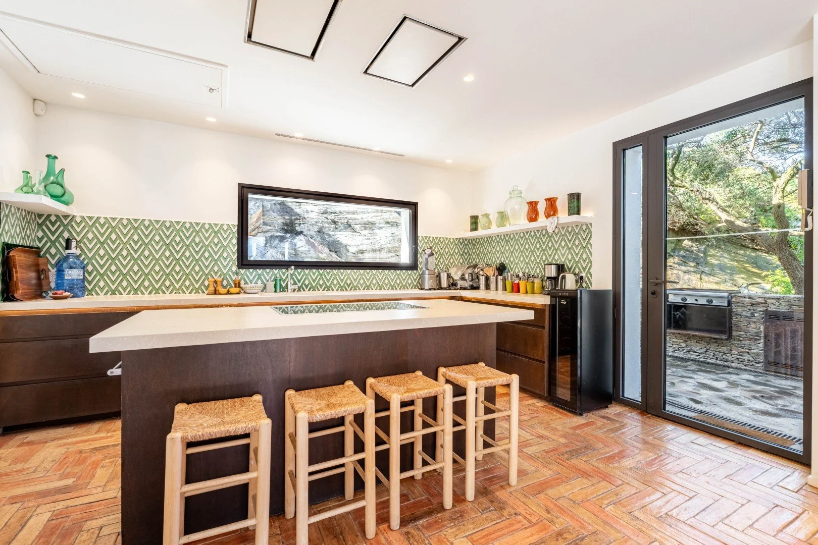 Outside, the property features an infinity pool with panoramic sea views, a direct access to the sea, spacious terraces for gathering, charming patios for alfresco lunches, a pétanque court, and a summer kitchen complete with plancha.